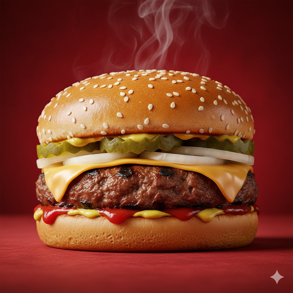 Uma explosão de sabores! Textura, suculência e ousadia em cada mordida no verdadeiro hambúrguer. Carne, pão, cheddar fatiado, picles, cebola, ketchup e mostarda.