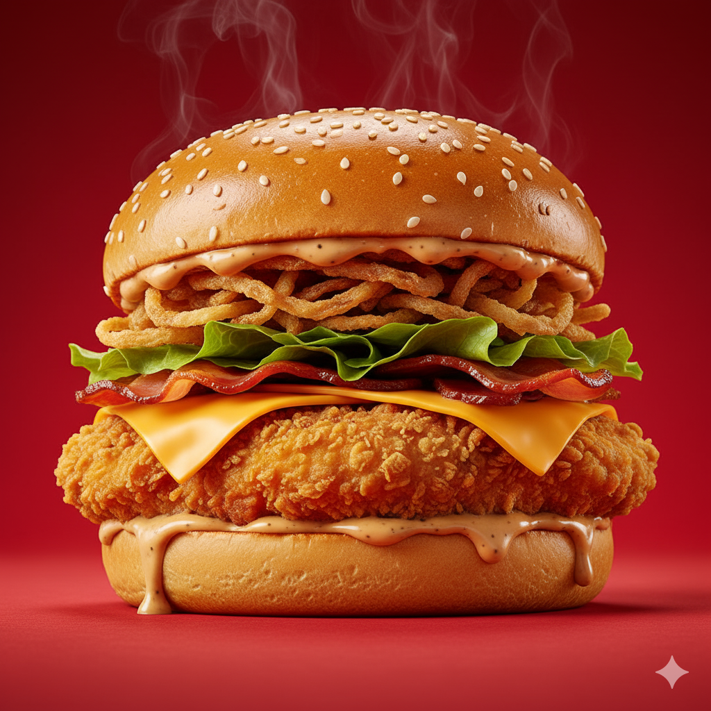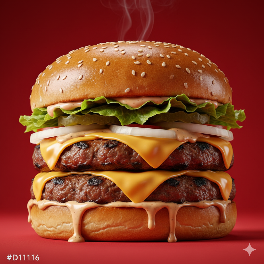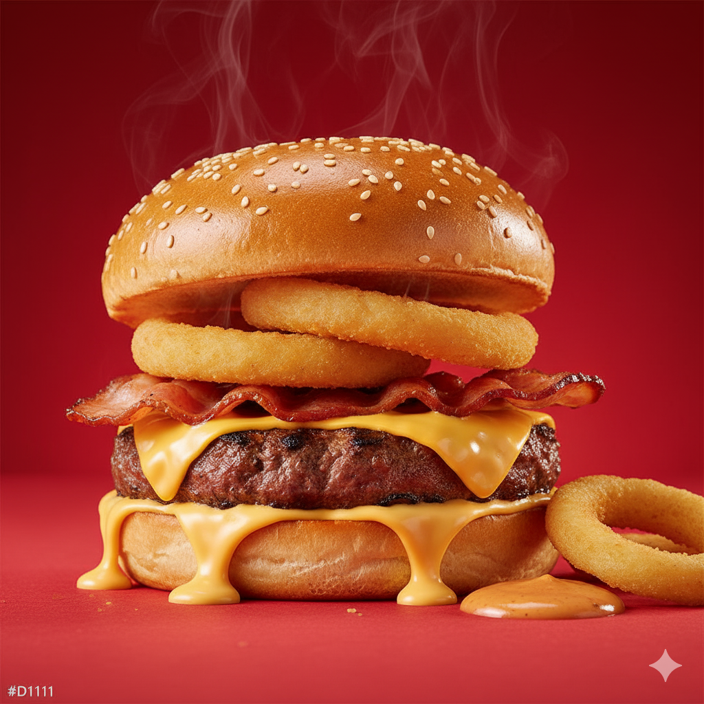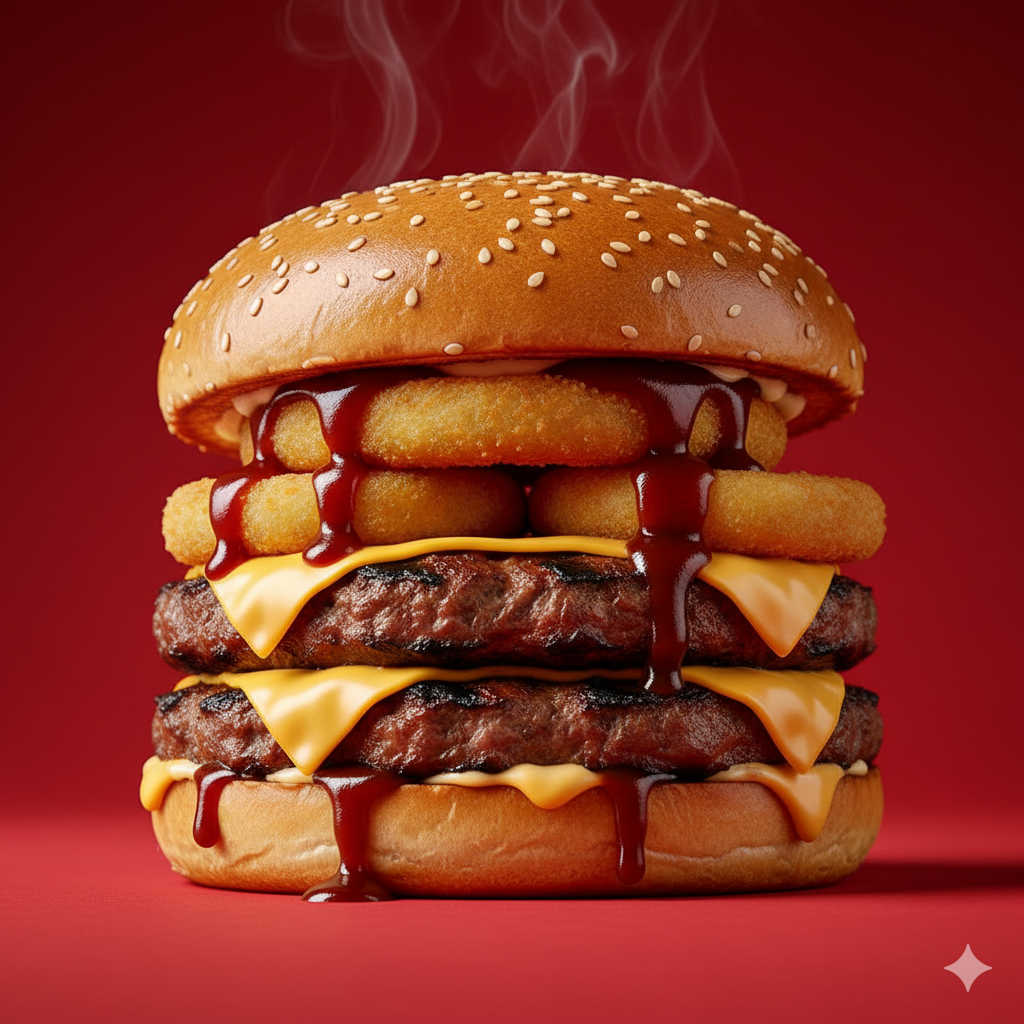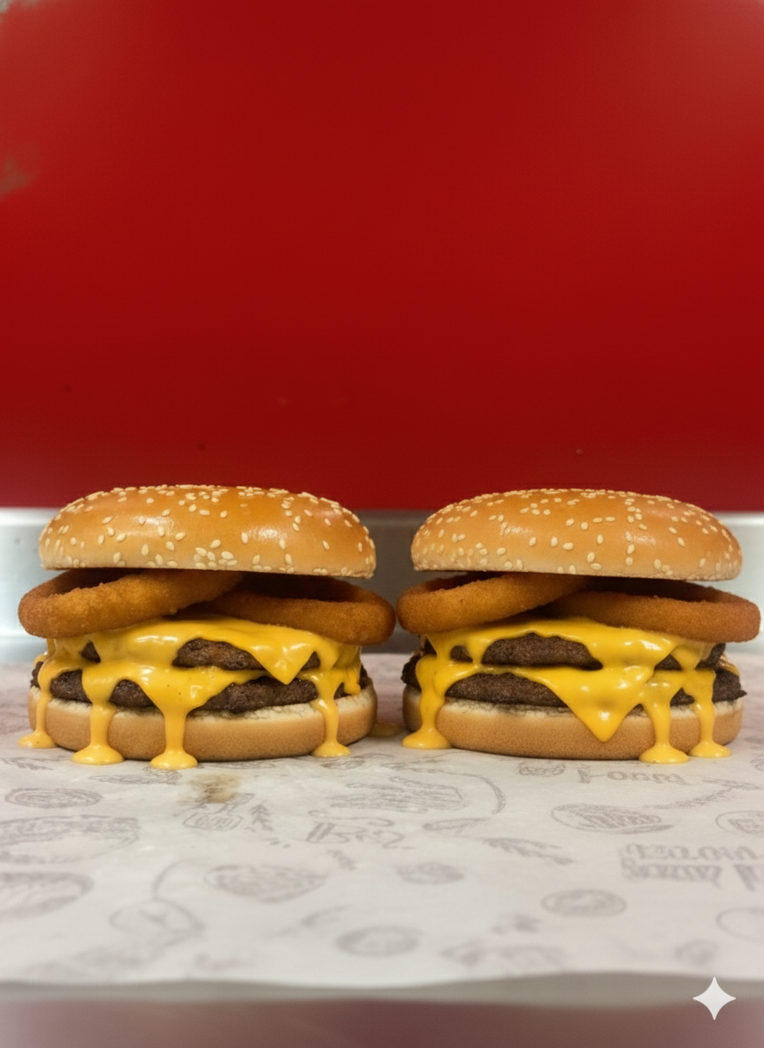 Duas vezes mais sabor! Duplo hambúrguer com cheddar, onion rings crocantes e molho barbecue. Ideal para os famintos por sabor. Carne, pão, cheddar fatiado, onion rings e molho barbecue.