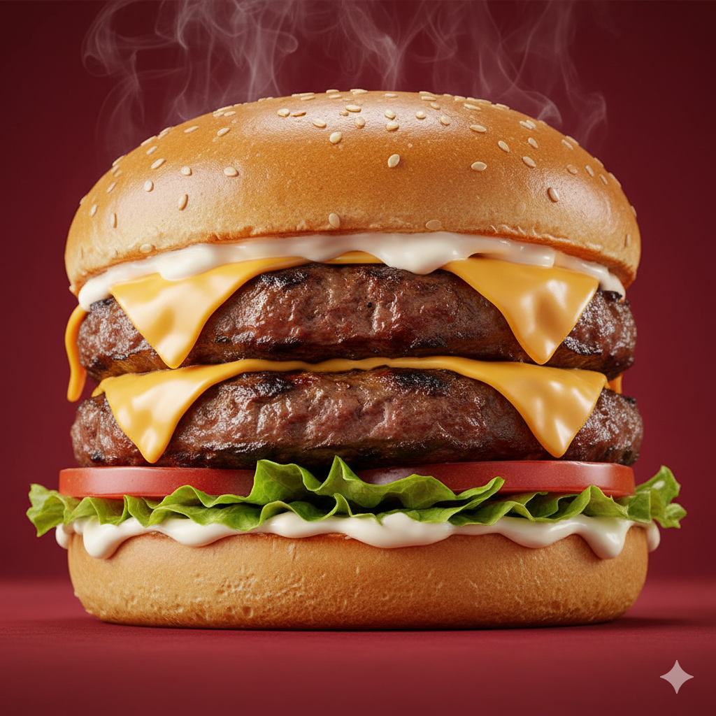 O tradicional hambúrguer em dobro. Simples, suculento e cheio de sabor — ideal pra quem ama o verdadeiro gosto do hambúrguer. 2x Carne, pão, cheddar fatiado, alface, tomate, maionese.