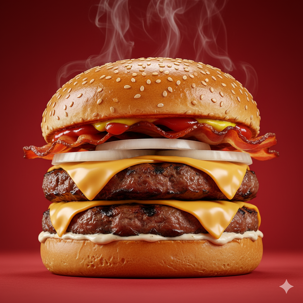 Delicioso do jeito que amamos! Com 2 carnes com cheddar fatiado, bacon suculento, ketchup, mostarda e cebola para dar mais sabor.