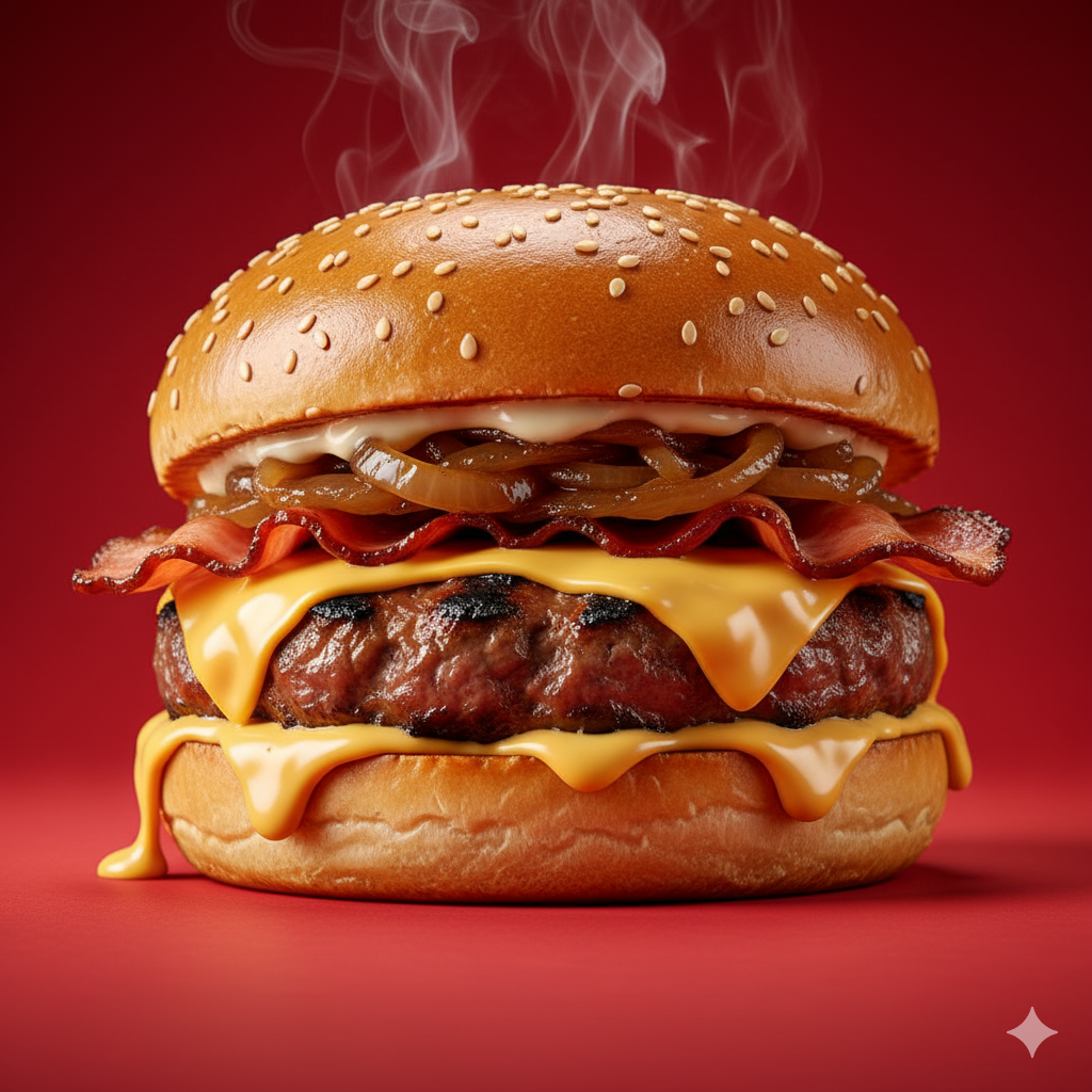 Intenso, suculento e cheio de sabor! Duas carnes de picanha grelhadas, cheddar fatiado derretendo na medida certa, fatias crocantes de bacon e o toque especial do nosso Molho barbecue. Tudo isso em um pão macio que completa essa explosão de sabor.
