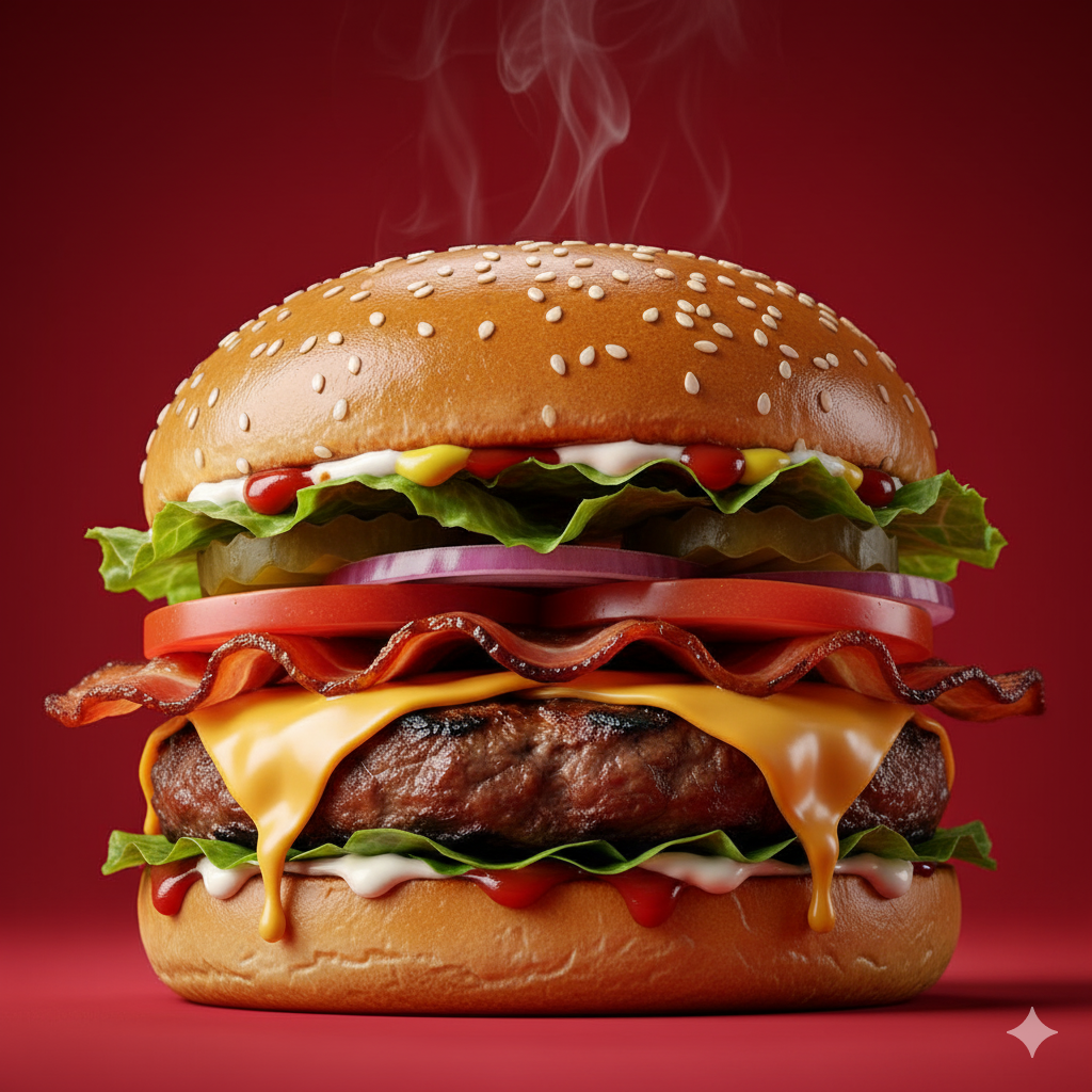 Um hambúrguer completo — bruto, suculento e com tudo que o seu apetite pede. Carne, pão, cheddar fatiado, bacon, alface, tomate, cebola, picles, ketchup, maionese e mostarda.